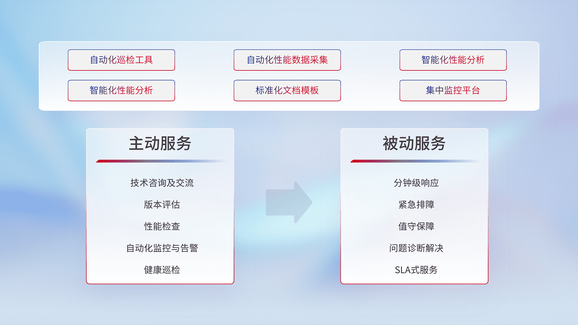 智能化工具和标准化文档,,,保障服务质量,,,提供主动服务(包含技术咨询、、、版本评估、、性能检查、、自动化监控与告警、、健康巡检)和被动服务包含(分钟级响应、、紧急排障、、值守保障、、、、问题诊断解决、、、、SLA服务)。。。